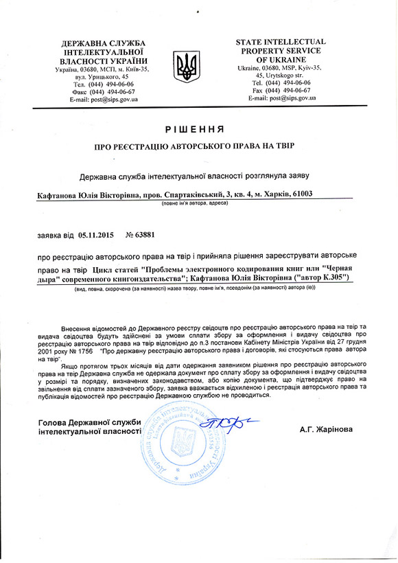 Защита авторских прав на наши издания - наш сертификат. Для увеличения сертификата кликните изображение мышью. Оказываем помощь в регистрации Ваших авторских прав на литературное произведение, цикл фотографий, информацию научного и иного характера и другое. Авторам - авторские права, оказываем помощь в регистрации и защите Ваших авторских прав в Украине (СНГ), новые услуги Клиентам с 2015-2021 года. Копировать и использовать третьими лицами наши сертификаты авторских прав запрещено.